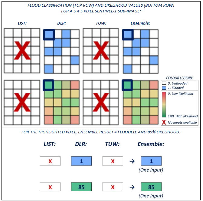 The GFM Ensemble flood mapping algorithm combines the flood classification results and likelihood values generated by the three individual flood mapping algorithms (LIST, DLR and TUW) for each input Sentinel-1 image grid-cell. The GFM Ensemble algorithm first assigns to each grid-cell a ratio equal to the proportion of individual algorithms providing inputs that classified the grid-cell as Flooded. A majority-based consensus rule is then used to classify the grid-cell as Flooded (i.e. ratio > 0.5), Unflooded (i.e. ratio <= 0.5), or Unclassified (i.e. no individual algorithm provided an input). The ten possible cases for classifying a grid-cell with the GFM Ensemble algorithm are shown in Table 18. The GFM Ensemble algorithm also computes the Likelihood Value for each grid-cell, as the average Likelihood Value computed by the individual algorithms providing inputs for that grid-cell.
