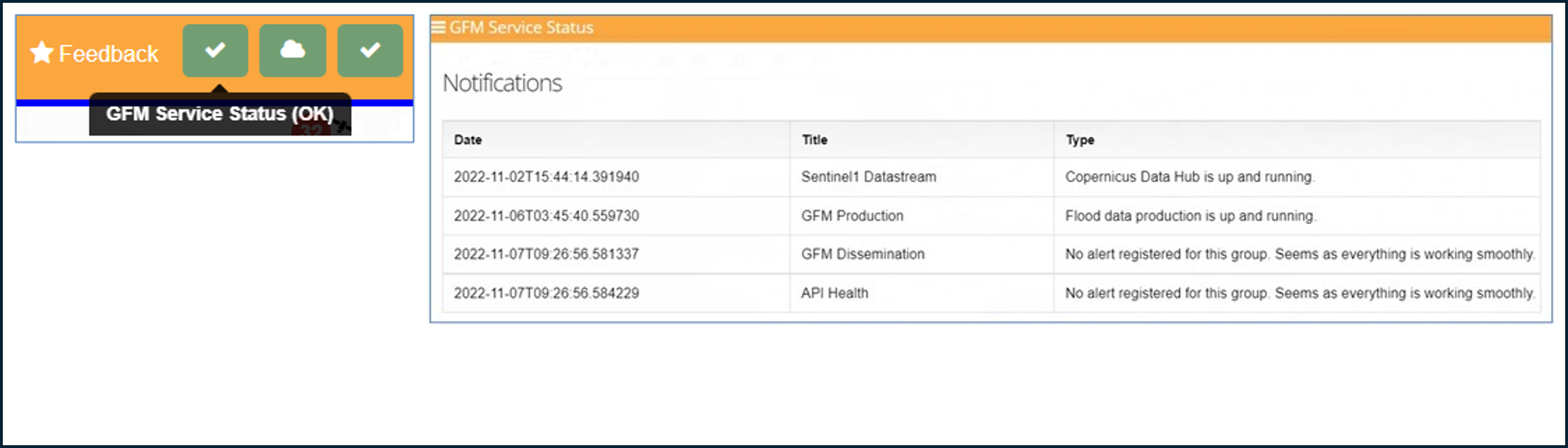 Also within EFAS Map Viewer, information about the overall health state of the GFM service is presented. An “alert sign” in the top menu, positioned on the right, next to the user profile indicates the health state of the service (left graphic below). Detailed information about the health state of the various components of the service can be retrieved by clicking on the “alert sign”.
