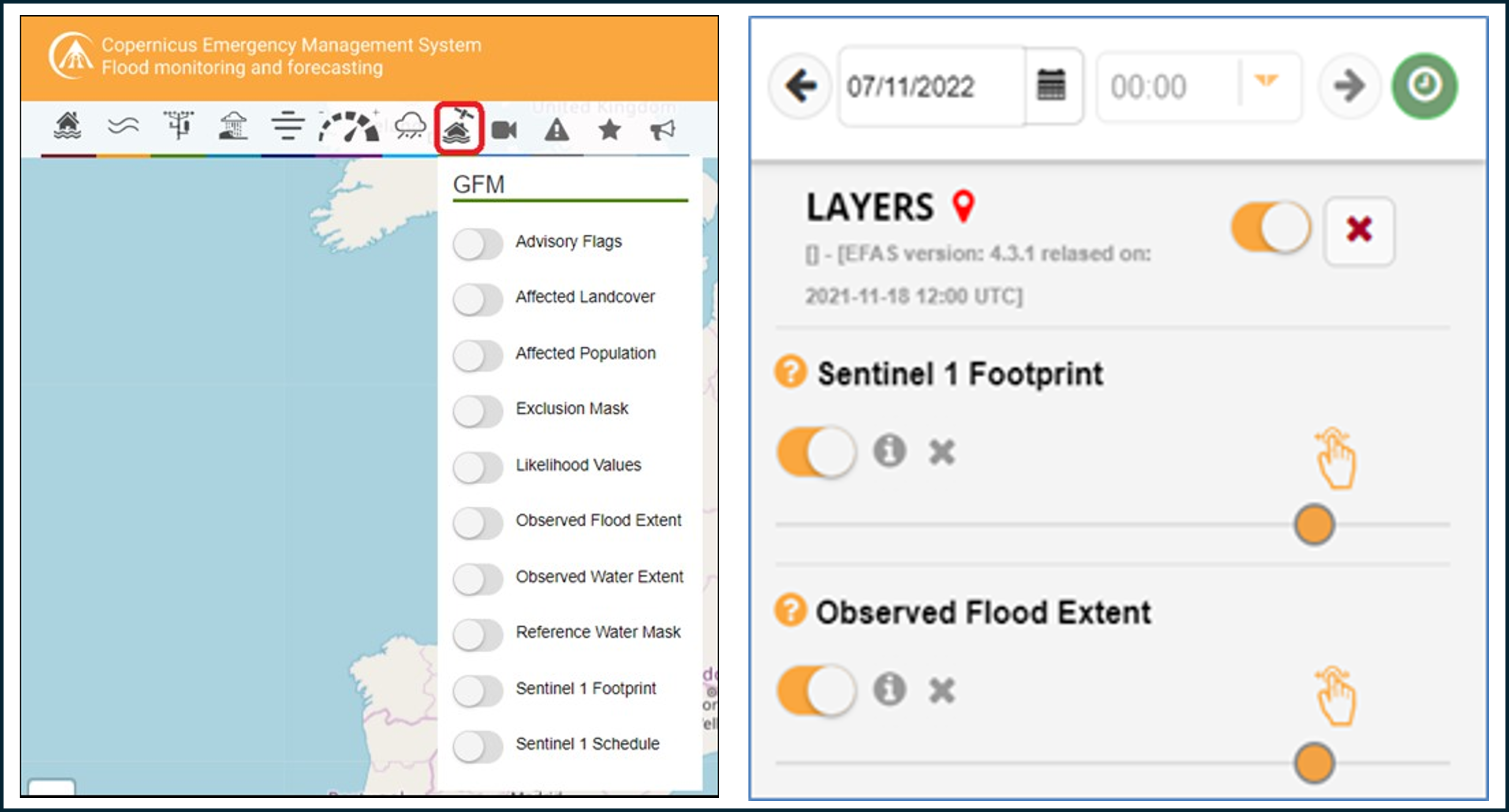 Once logged in, GFM output layers are listed in the top bar under the “GFM” menu (left graphic below, red rectangle). Each layer is visualized by toggling to the “on” position. The layer is then added to the dynamic layer list on the right on the screen (right graphic below).