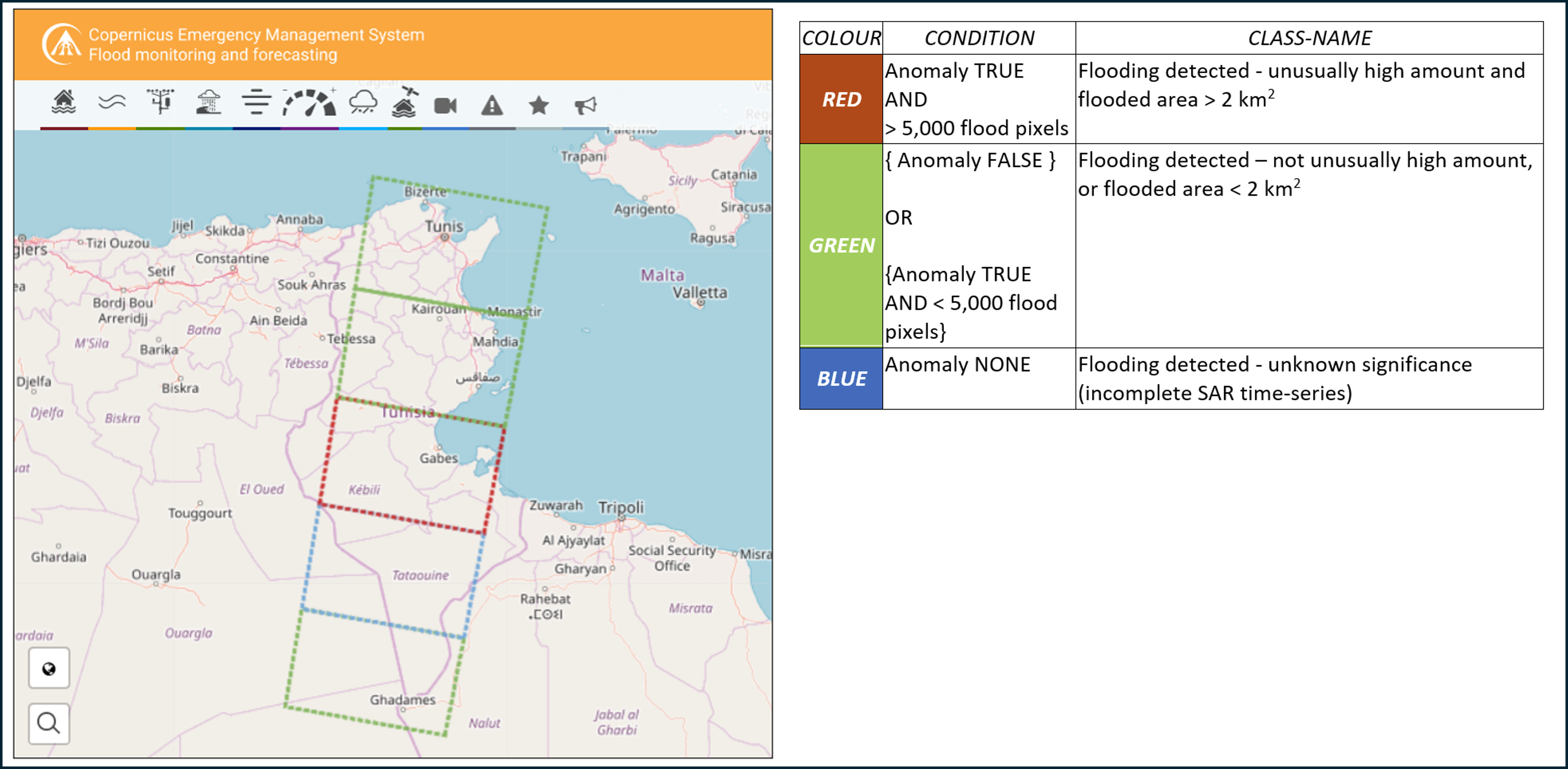 When the Observed Flood Extent output layer is switched on, the EFAS Map Viewer displays the S-1 tiles (left graphic below) for which GFM detected flooded areas, with the amount of flooding indicated by colour-coding (right graphic below).