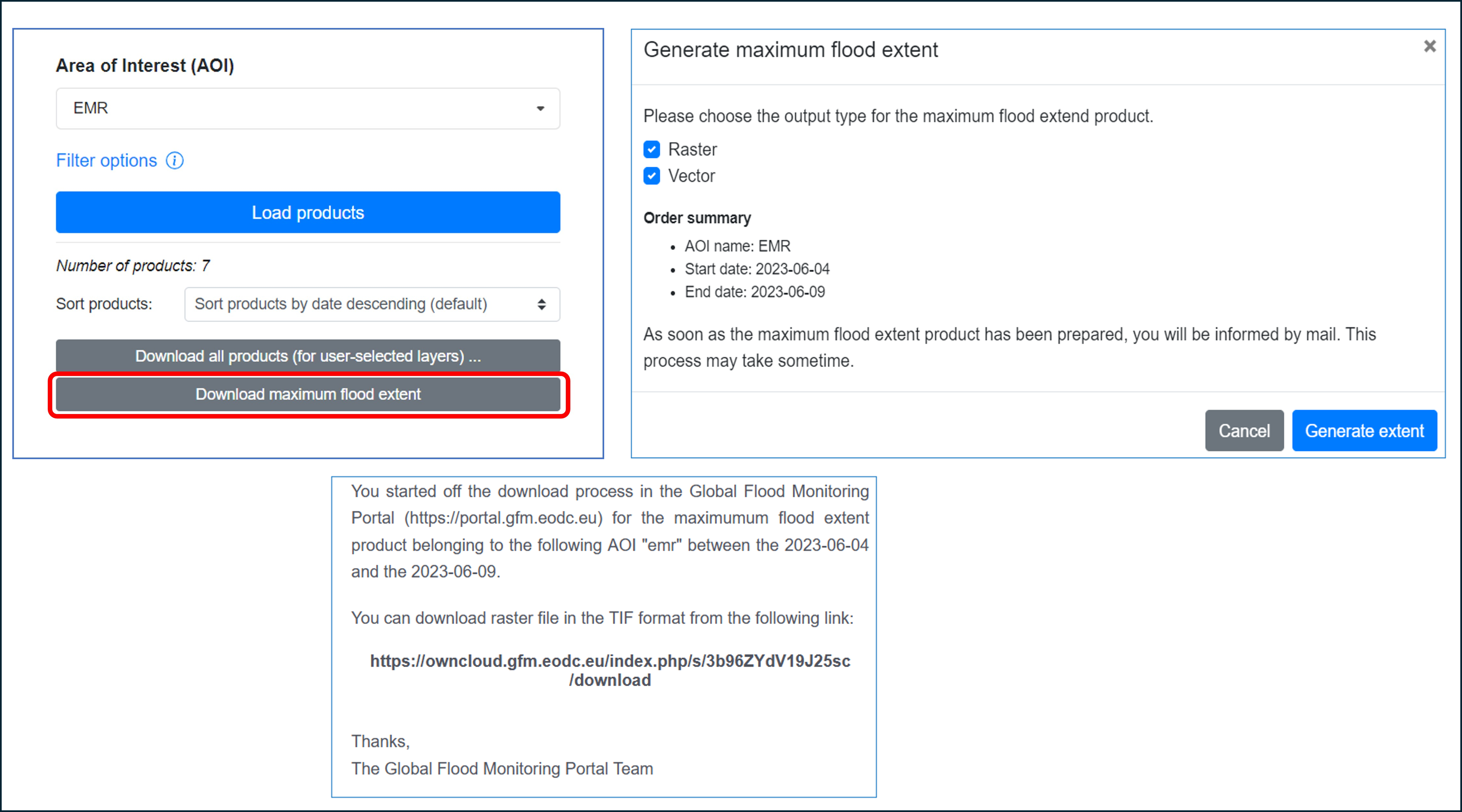 | 1. The maximum flood extent is the composite of all Observed Flood Extent output layers available for a user-defined period. A request for the maximum flood extent for an AOI is made by selecting “Download maximum flood extent” (top left graphic below). |