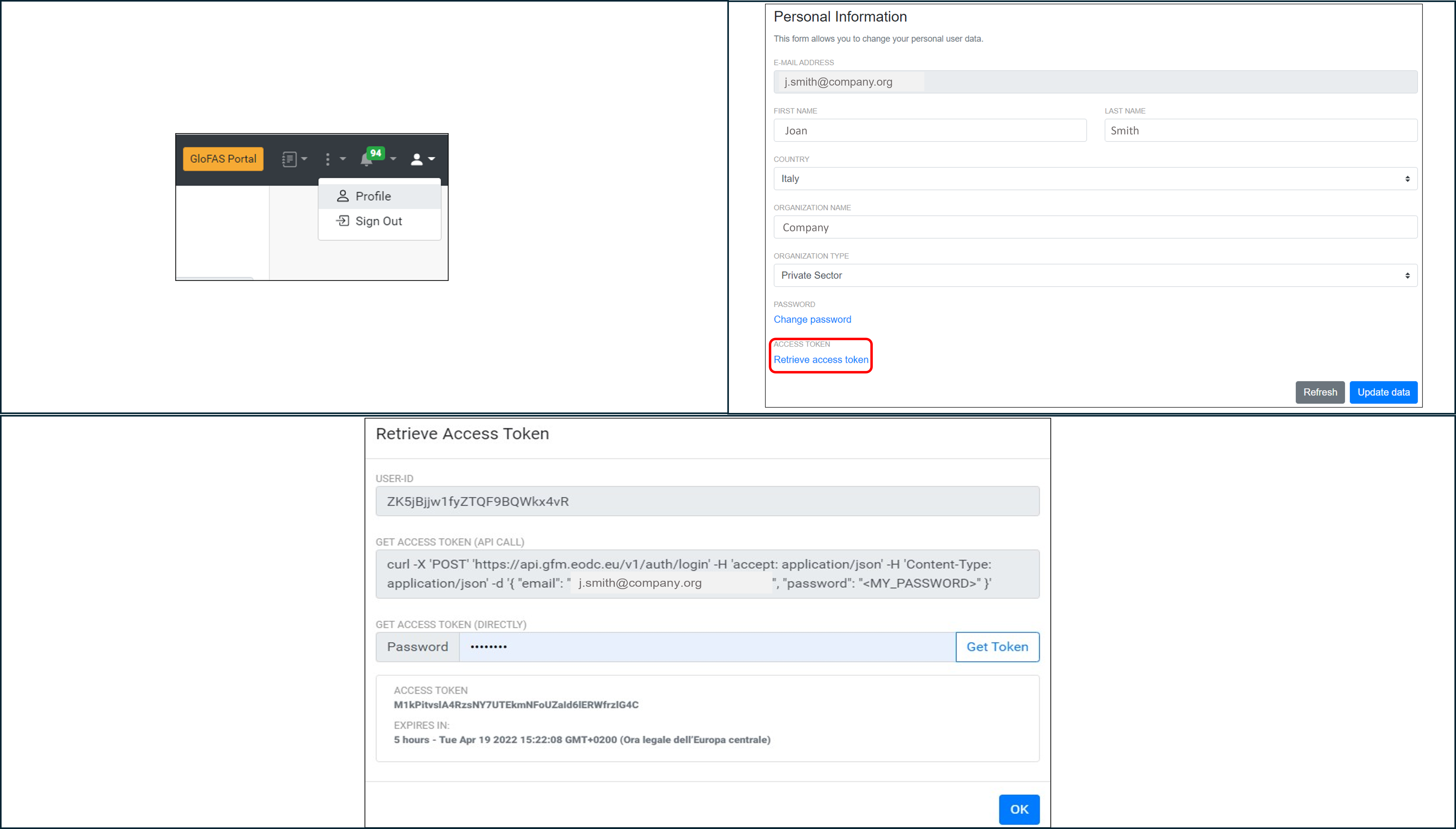 | 1.GFM offers the possibility to access its products through a set of REST-APIs. To use the APIs, users need to get an access token that can be retrieved in their "Profile" section of the GFM Web Portal (top left graphic below). |