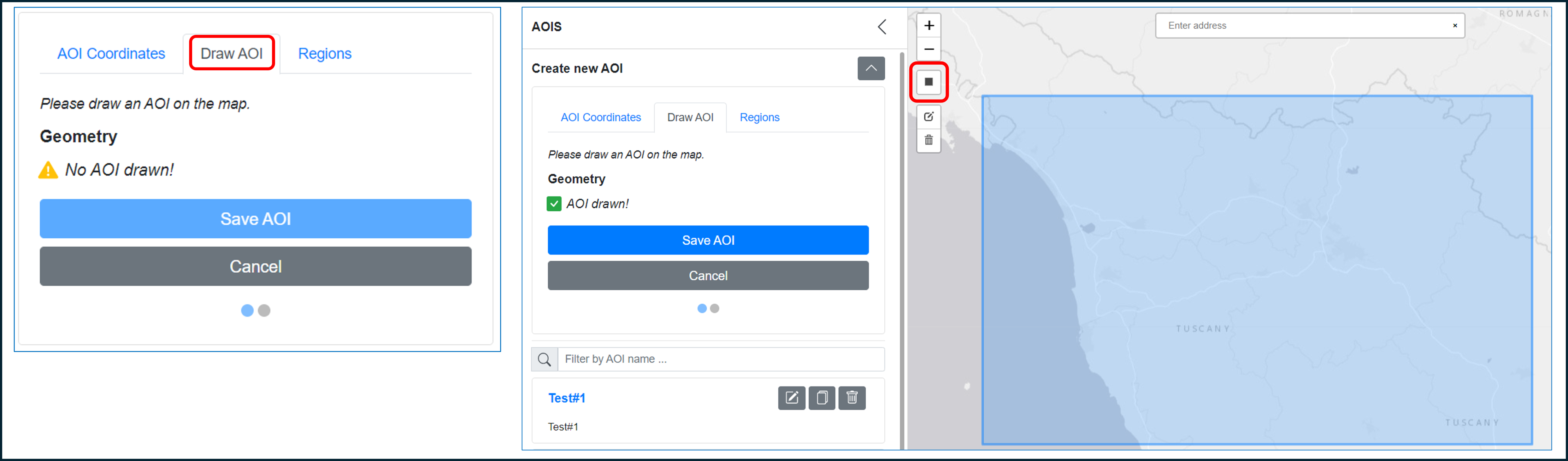 Select the "AOI Coordinates" button, enter the upper-left and lower-right latitude and longitude coordinates of the AOI, and click another button, for example “Draw AOI” (left graphic below). The system will display the selection on the map (right graphic below). Save the AOI (using the “Save AOI” button) to add the AOI to the list of AOIs.