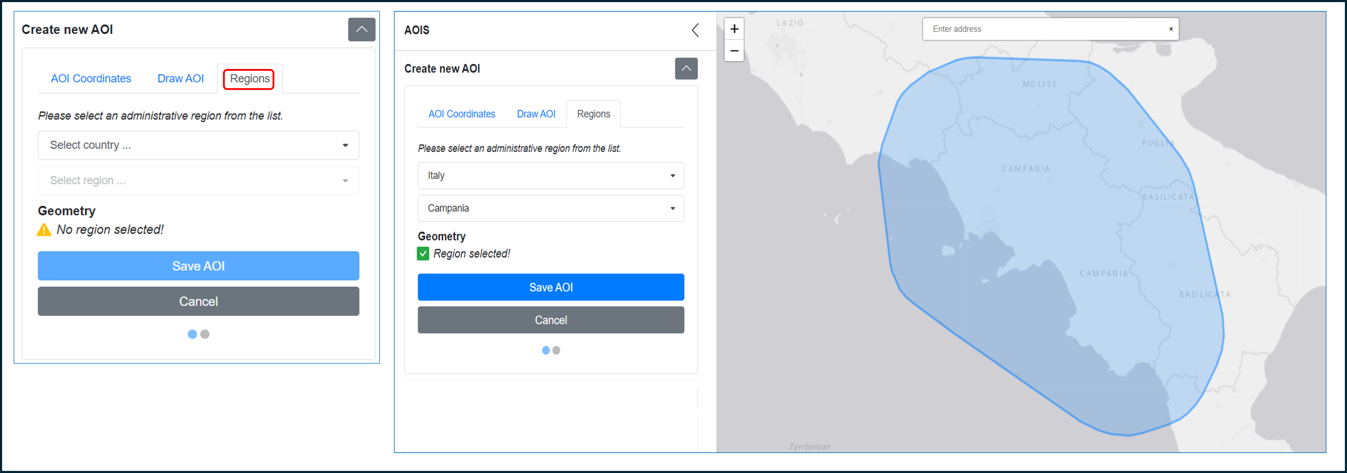 Select the “Regions” button (left graphic below), and then through the dedicated drop-down menus choose the Country and the Region of interest. In this case the system will automatically draw a polygon fully encompassing the Region of interest (right graphic below). If the AOI is satisfactory, the “Save AOI” button will add the AOI to the list.