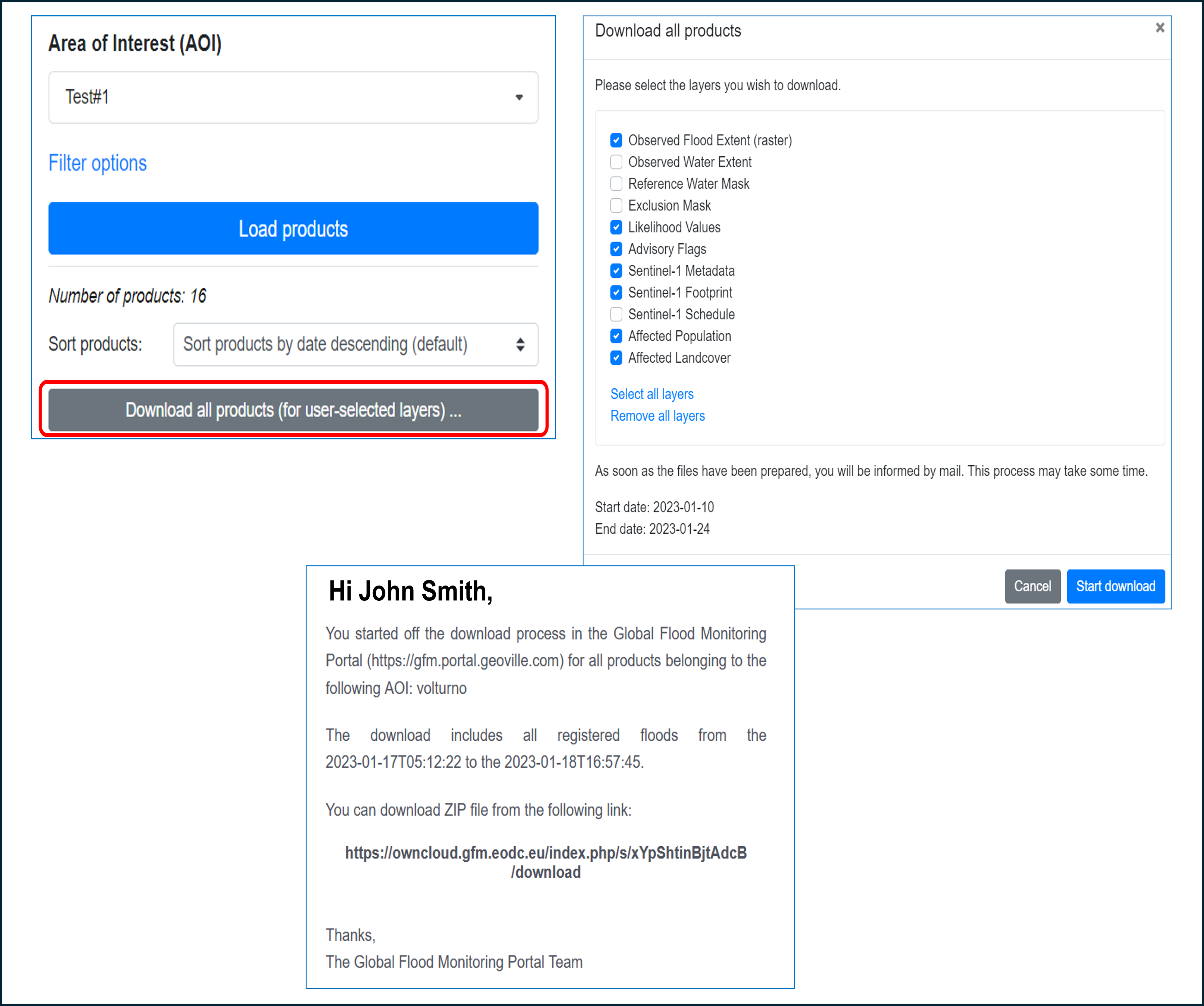 | 1. If multiple dates are available, users can download all GFM output layers for all dates, by clicking on the button “Download all products” (top left graphic below, red circle). |