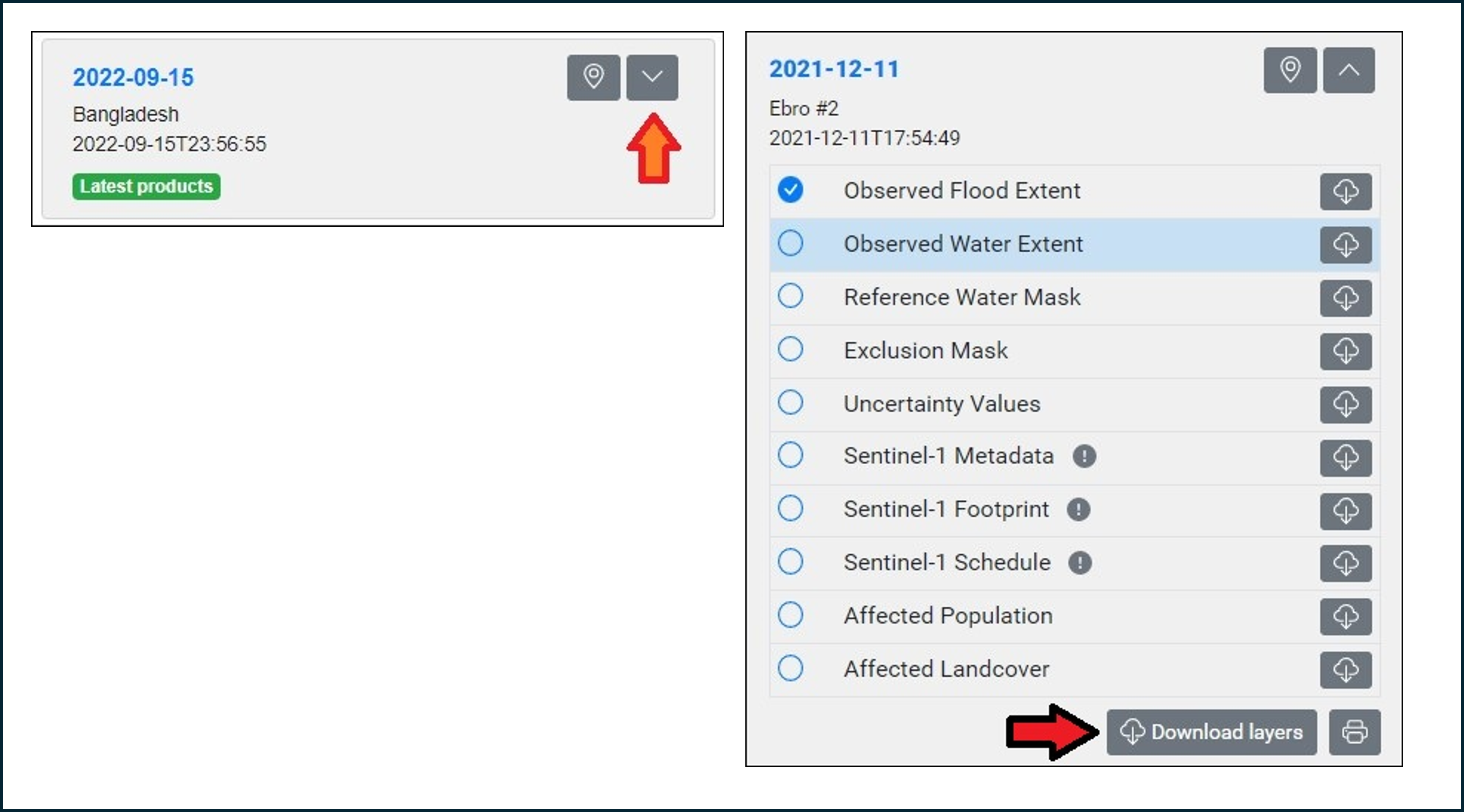 To download selected GFM output layers for a specific date, first select the output layers (left graphic below, red arrow), and select “Download layers” (right graphic below, red arrow).